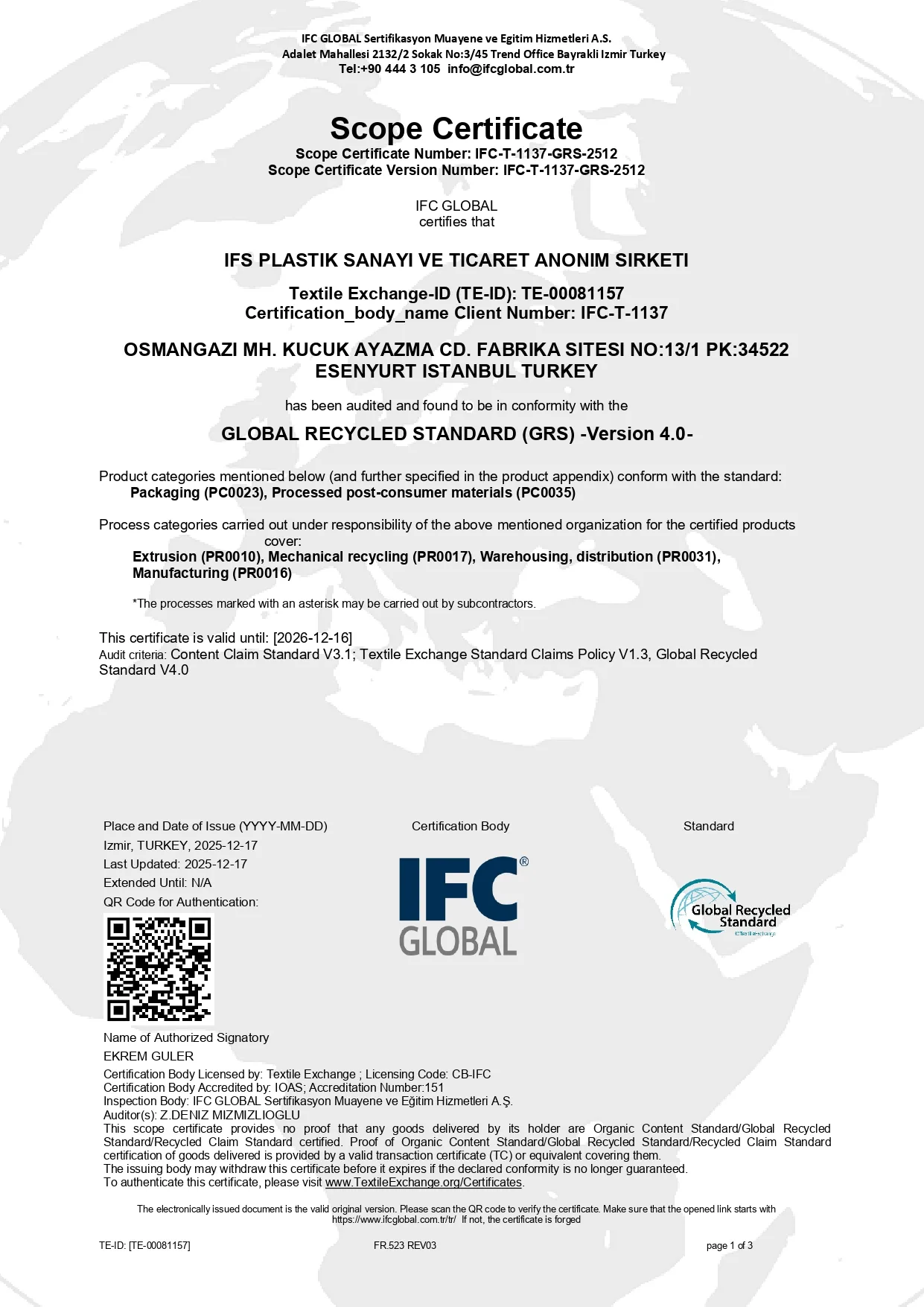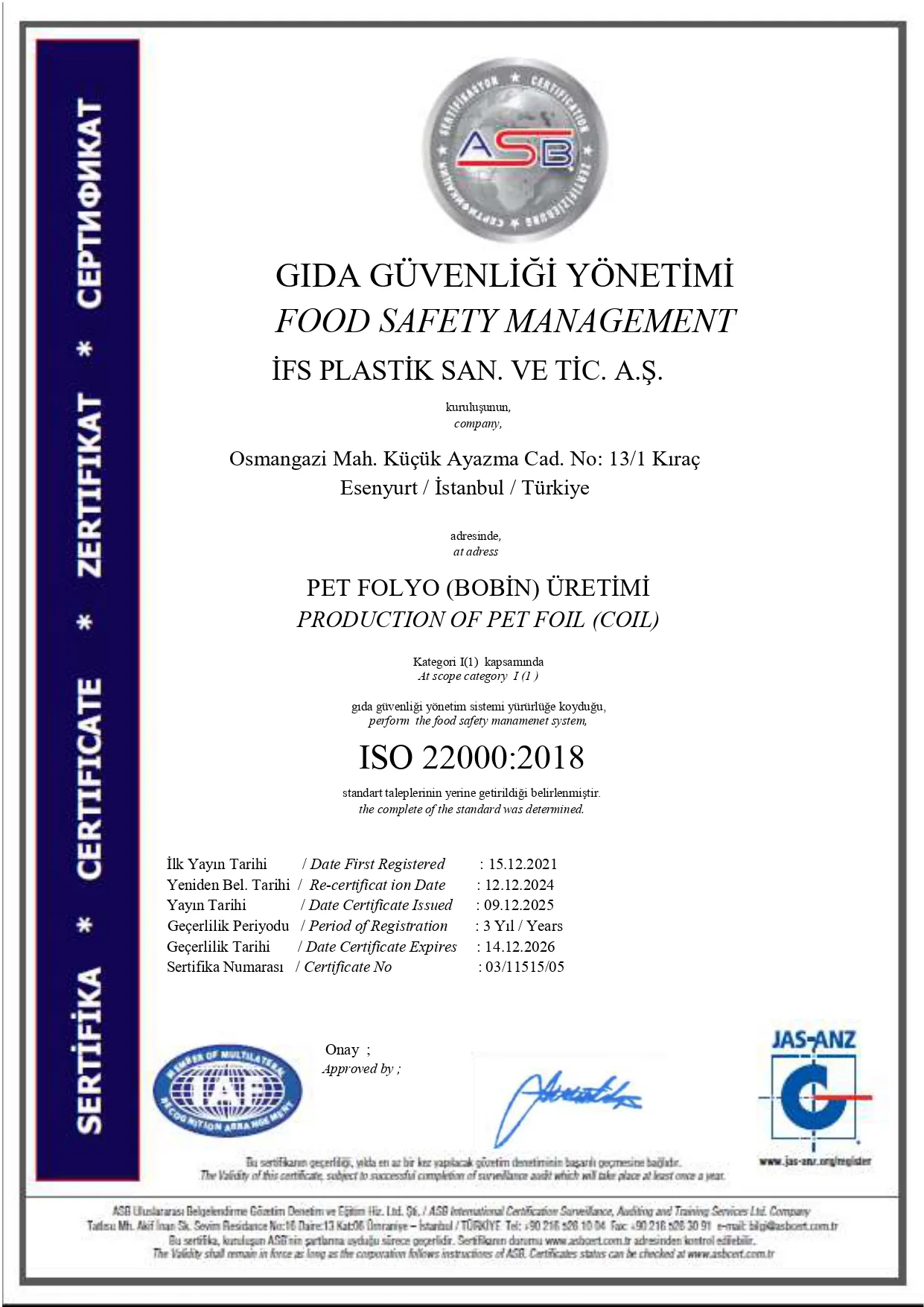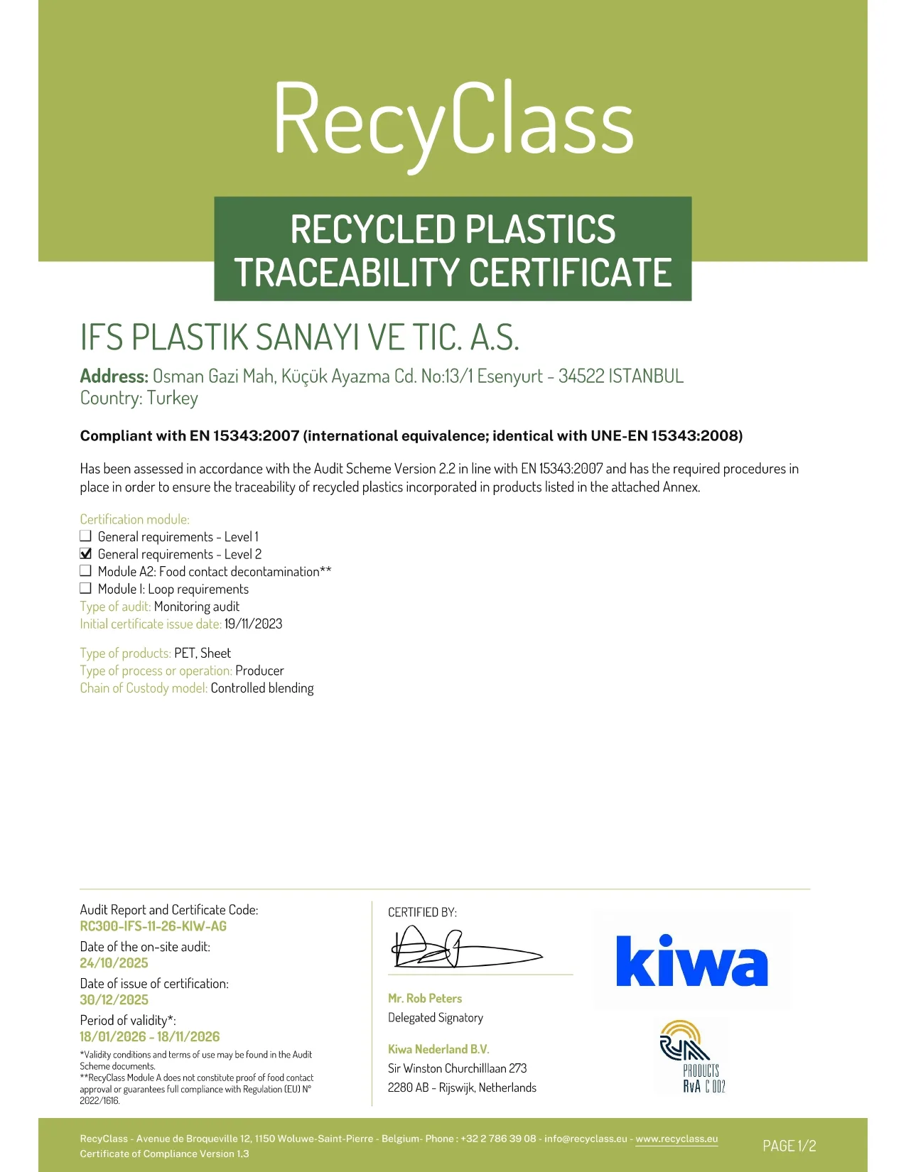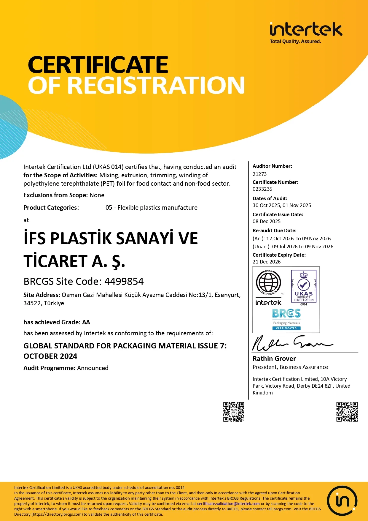 Firmamızda her yıl düzenli olarak FDA, Migrasyon, NIAS, REACH ve FPAS analizleri gerçekleştirilmektedir. Analiz raporları için firmamız yetkilileriyle iletişime geçebilirsiniz. Ayrıca, Avrupa Birliği’nin gıda ile temas eden geri dönüştürülmüş malzemelere ilişkin 2022/1616 sayılı Regülasyonu kapsamında RIN, RFN ve RON kayıtlarımız bulunmaktadır. Talep edilmesi halinde tarafınıza sunulabilir.